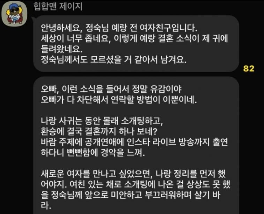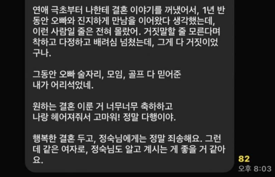 특히, 전 여자친구의 주장대로라면 예비신랑은 정숙과 공개 연애를 하면서도 몰래 전여친과 연락을 주고받았던 것으로 보입니다. 이에 대해 많은 네티즌들은 "이건 확실한 양다리", "정숙이 이 사실을 알고도 결혼을 강행할까?" 등의 반응을 보이며 논란은 점점 커지고 있습니다.