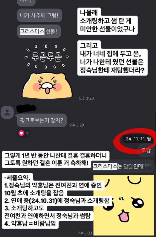 이러한 폭로와 함께 예비신랑과의 카카오톡 대화 캡처본이 공개되었으며, 날짜가 겹치는 정황이 포착되면서 논란은 더욱 커졌습니다.