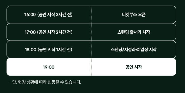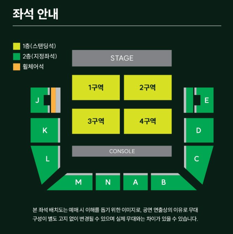 - 1층 스탠딩석: 예매 시 지정된 번호가 입장 순서이기 때문에, 무대와 가까운 위치에서 공연을 보고 싶다면 앞번호를 예매하는 것이 좋습니다.