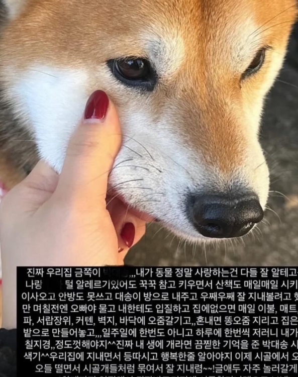 문제가 된 인플루언서는 시바견 "대송"의 사진을 인스타그램 스토리에 올리며 다음과 같은 내용을 작성했습니다.
