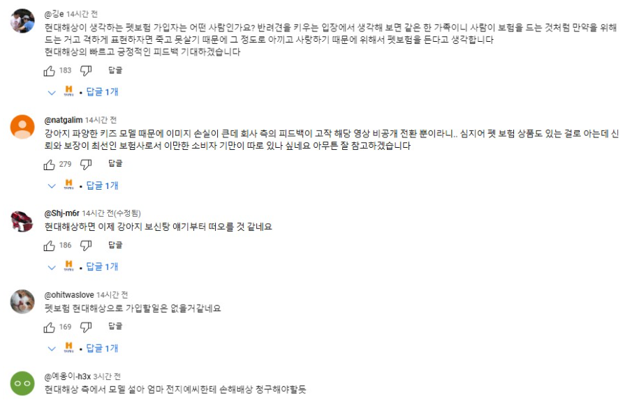 논란이 커지자 누리꾼들은 해당 인플루언서가 현대해상의 키즈모델 엄마라는 점을 지적하며, 해당 보험사의 유튜브 채널과 광고 영상에 항의 댓글을 쏟아냈습니다. 일부 네티즌은 "현대해상은 펫보험도 판매하는데, 모델 엄마가 반려동물을 이런 식으로 대우하는 것이 적절한가"라는 비판을 제기했습니다.