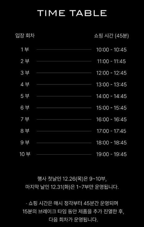 TIP: 첫날과 마지막 날의 운영 시간이 다르므로 방문하실 분들은 아래 타임 테이블을 참고하세요!