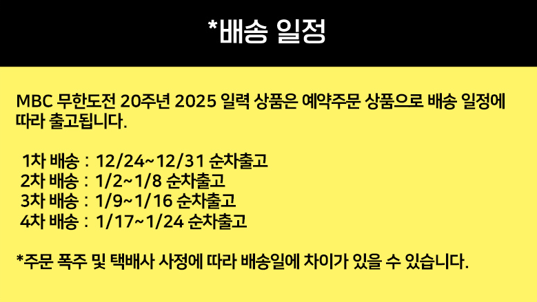 2025 무한도전 20주년 기념 달력은 12월 11일 오후 6시부터 교보문고 온라인몰에서 사전예약을 시작했습니다. 현재 4차 판매 물량이 진행 중이며, 이전 배송 물량은 빠르게 매진된 만큼 서둘러야 합니다.