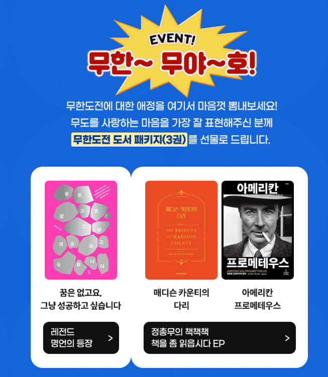 달력 구매자 대상 이벤트도 진행됩니다. ‘2025 무도고시’에 응시하고 참여 완료 댓글을 남기면 무한도전 도서 패키지 3권을 받을 기회가 주어집니다.